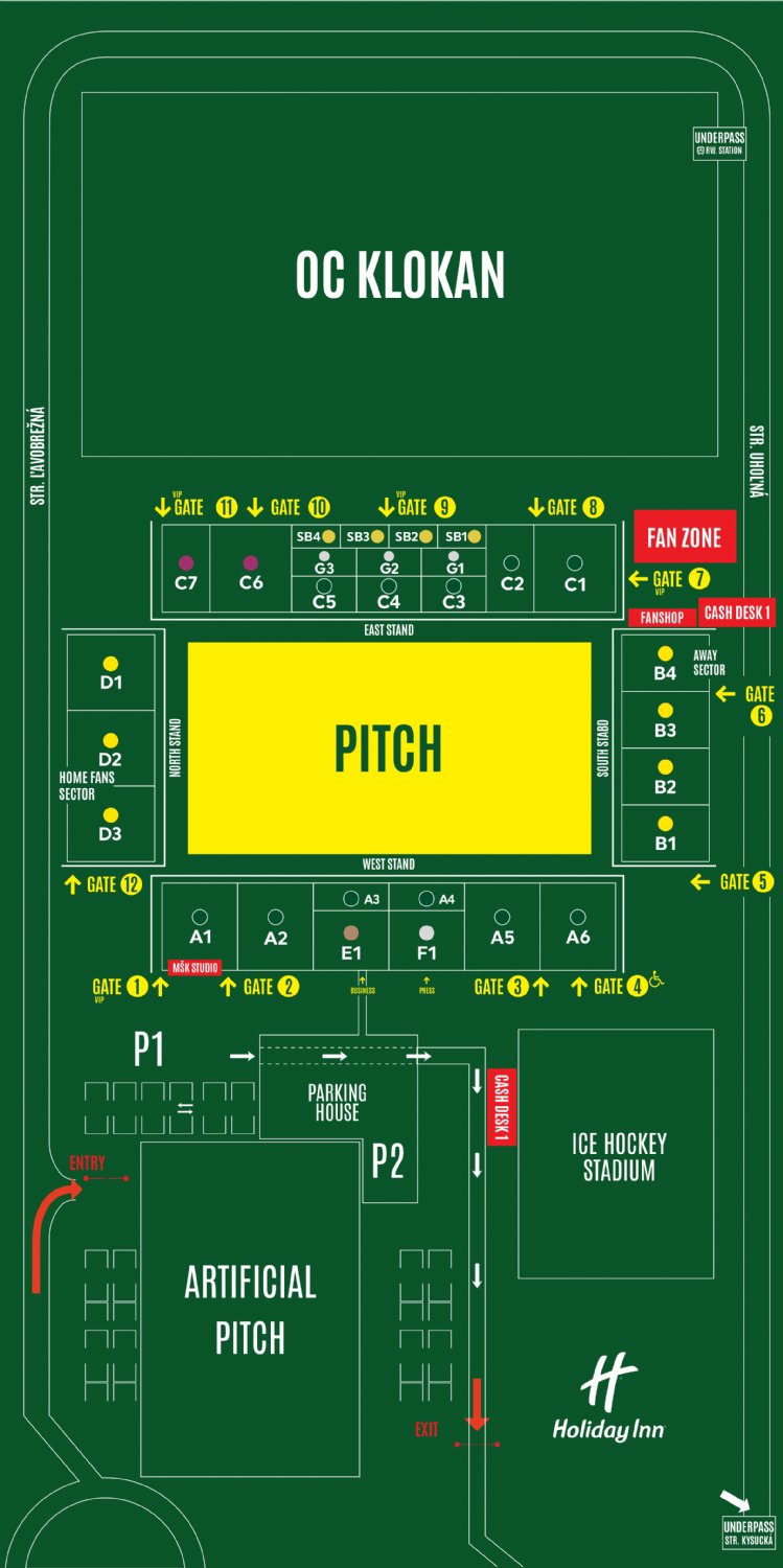 - ENTRY ZT - only from Ľavobrežná street (see map). The ramp will be open 2 hours before the match. Entrance from Holiday Inn will be closed for vehicles.