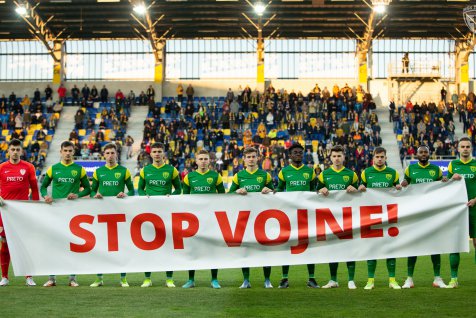 Ešte pred samotným výkopom Šošoni pri spoločnom nástupe vyjadrili solidaritu so situáciou na Ukrajine transparentom #stopvojne. Nezatvárame oči. Nejde o politiku. Ide o ľudskú dôstojnosť a solidaritu. Ukrajina, #staystrong.
