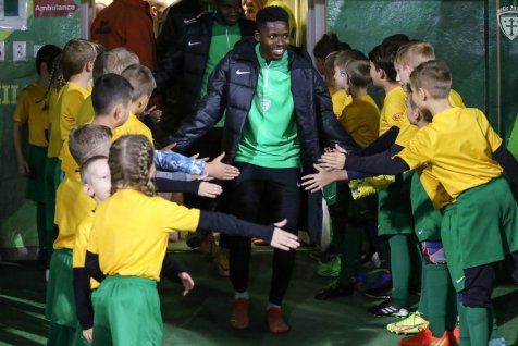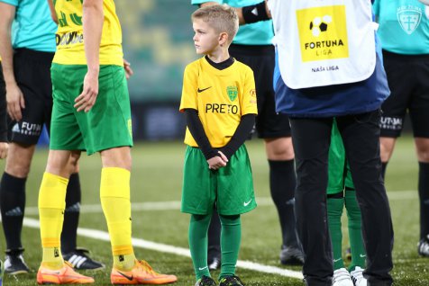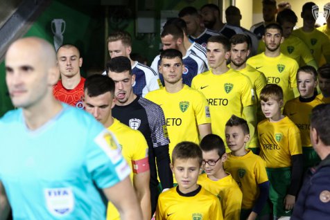 Pod umelým osvetlením sme začali aktívne, v 3. minúte už aj s prvým ohrozením brány. A nemuselo ostať iba pri ohrození. Nacvičený signál sa dostal k Dávidovi Ďurišovi, ktorý z ideálnej palebnej pozície prestrelil. Aktívny úvod z našej strany pokračoval a po ďalšej biliardovej akcii vyvrcholil už aj do úvodného gólu. Aďo Kaprálik svoju strelu spoza šestnástky ideálne skryl na namieril od tyče za Chovanov chrbát - 1:0. Na chvíľu to utíchlo, no v 17. minúte mohlo byť znova veselo. Chovan loptu neudržal, dorážka Ďuriša z tesnej blízky ale preletela až ponad brvno. Tribúny žili a s nimi aj Šošoni na trávniku, ďalšie prečíslenie na seba vzal Timotej Jambor. Jeho prízemnú strelu slovanistický gólman nohou vyrazil na roh. No a žltozelení sa im odvďačili druhým gólom. Rýchla a nedostihnuteľná akcia dvojice Kaprálik - Rusnák prišla z pravej strany. Chalani si vymenili loptu, Rusky to nabil Kapovi a ten zvnútra šestnástky zakrútil loptu presne k žrdi - 2:0. Pri takomto vedení nám to šlo o čosi ľahšie, k ďalšiemu zákroku prinútil Chovana svojím priamym kopom Jambor. A aby to nebolo iba o chválení ofenzívy, dozadu rovnako šľapali všetci hynkovci vzorne, čím Ľubovi Belkovi podstatne uľahčovali prácu. Ten si v 33. minúte pripísal svoj prvý zákrok po málo razantnej strele Zmrhala. No a 35 minút stačilo Adriánovi Kaprálikovi na hetrik, na zadok posadil Lovata, prenikol do šestnástky a nekompromisne to tam uložil pomedzi nohy obrancu po tretíkrát - 3:0. Zjavne zaskočený Slovan ukazoval svoju kvalitu, Belko skryl 40. minúte nepríjemnú strelu Weissa. Rovnako sa vyznamenal aj v nadstavenom čase po hlavičke Kucku, ktorú vytlačil na roh a ktorou ukončil takmer dokonalé prvé dejstvo.