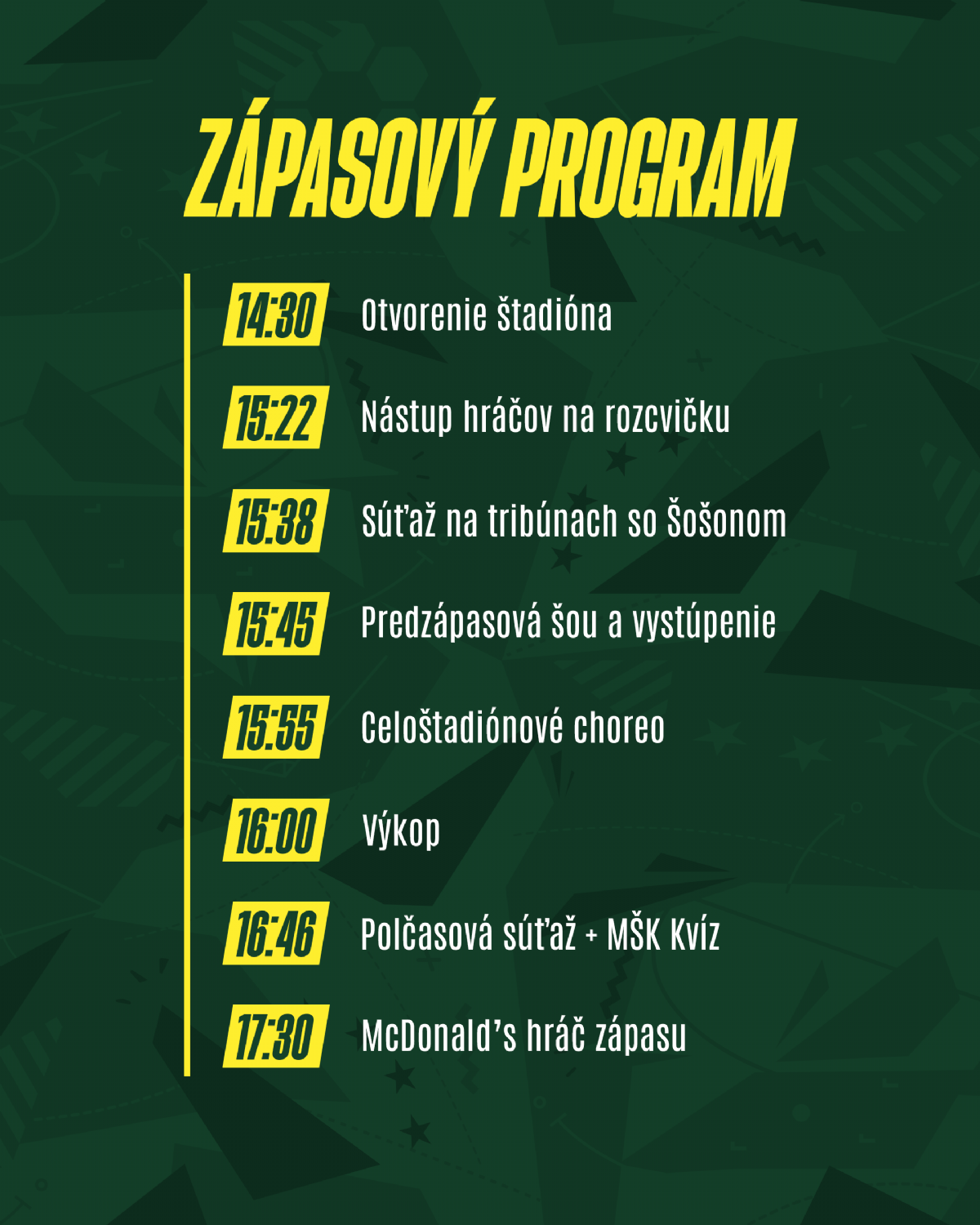 Opäť chystáme už od 12:00 hod. na umelej tráve (vchod cez Športovú ulicu) bohatú Fanzónu MŠK so sprievodným programom, atrakciami, súťažami a maskotom Šošonom. Skorší príchod vám umožní komfortnejší vstup na štadión a plynulý priebeh celej návštevy.