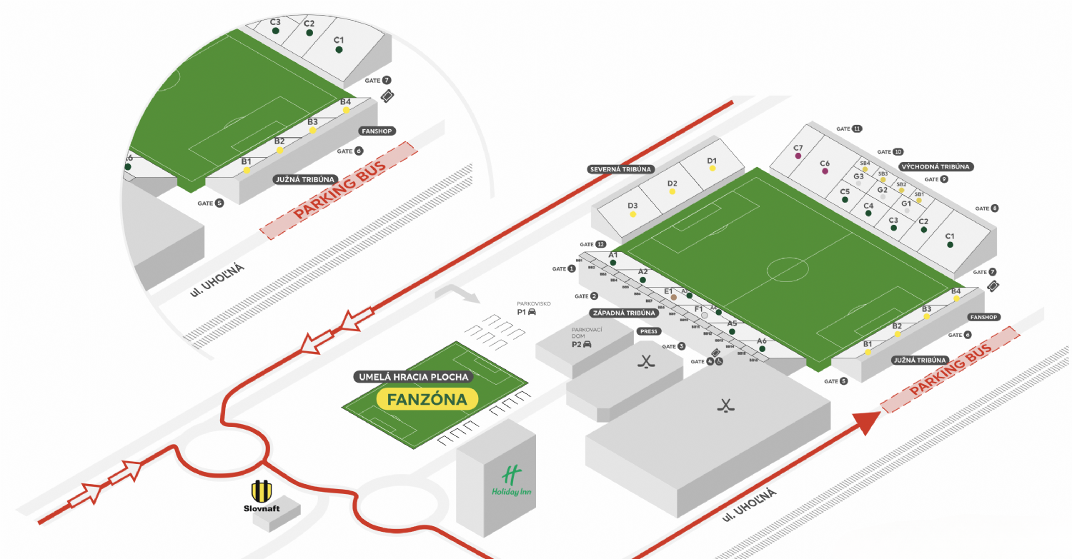 - prístupné iba pre hráčov, realizačný tím, delegované osoby, návštevníkov business boxov, médiá, určených hostí a ďalšie nahlásené ŠPZ.