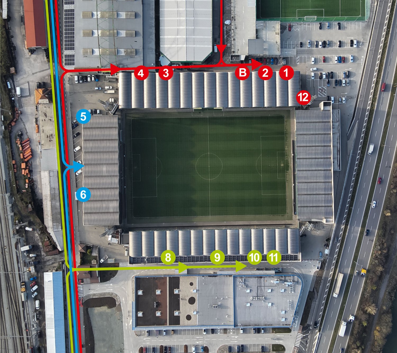 Ostatným návštevníkom odporúčame prísť na štadión pešo, resp. MHD či vlakmi, alebo zaparkovať v meste na priľahlých parkovacích plochách alebo v nákupných centrách a prísť na štadión pešo tunelom popod železničnú stanicu.