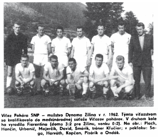 - 1961/1962, kedy v Pohári víťazov pohárov zdolalo Dynamo grécky Olympiakos Pireus na jeho pôde 3:2 a aj v domácej odvete 1:0 (foto nižšie). Na jar 1962 sme vyhrali vo štvrťfinále nad Fiorentinou 3:2, pričom Taliani prvýkrát hrali futbal na snehu. V odvete sme podľahli fialkám 0:2 a vypadli (foto nižšie).