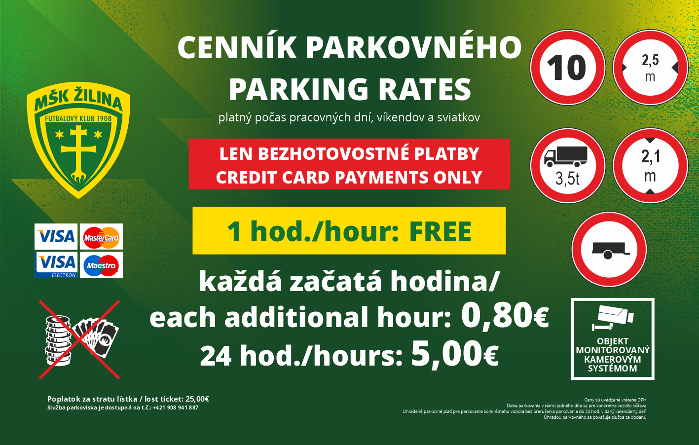 Všetky parkoviská v areáli Štadióna MŠK Žilina budú spoplatnené bežnou tarifou v zmysle cenníka (viď nižšie). Viac informácií pre návštevníkov poskytnú priamo firmy a prevádzky sídliace na Štadióne MŠK Žilina.