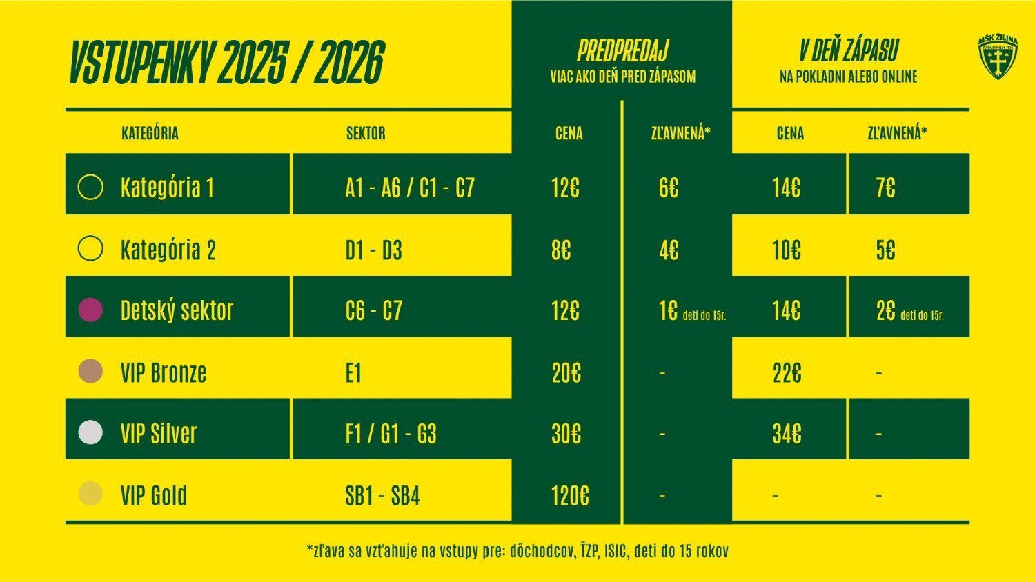 *Držitelia preukazov ŤZP-S (preukaz s červenou čiarou) majú vstup majú vstup do sektoru A5 a A6 zdarma (je potrebné si na pokladni vopred vyzdvihnúť nulovú vstupenku).