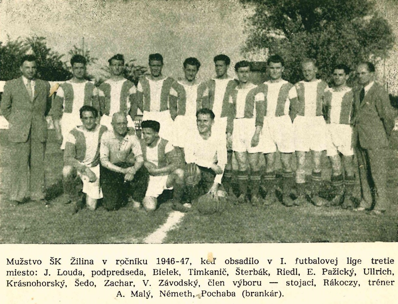 Káder ŠK Žilina v sezóne 1946/1947: Pochaba, Šterbák, Riedl, Rakovský (Rákoci), Šedo, Timkanič, Zachar, Ullrich, Bielek, Zőrgő, Pažický, Németh, Stalmašek, Krásnohorský, Szabó, Skach, Stárek, Zeman, Šanca.